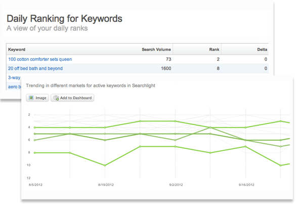 Searchlight提供了關(guān)鍵詞、搜索量及排名等的波動(dòng)信息表。需要監(jiān)控每日關(guān)鍵搜索信息波動(dòng)情況的搜索市場(chǎng)人員,不再需要等待特定數(shù)據(jù)來作決策了。Searchlight提供了他們需要的即時(shí)決策的實(shí)時(shí)信息,并可以不斷的優(yōu)化自然搜索流程,以此來提升流量和增加收入。