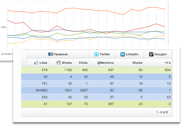 社會(huì)化媒體對(duì)SEO的影響一直在進(jìn)化中,重要的社會(huì)化媒體信息對(duì)于企業(yè)及其競(jìng)爭(zhēng)對(duì)手來說,是SEO戰(zhàn)略的一部分。通過conductor的集成平臺(tái)-SEO云,它會(huì)針對(duì)你和競(jìng)爭(zhēng)對(duì)手的url提供實(shí)時(shí)的社會(huì)化媒體信息。共享SEO和社會(huì)化媒體信息,對(duì)于企業(yè)來說,是一個(gè)關(guān)系緊密的線上戰(zhàn)略。Searchlight提供以下社會(huì)化媒體信息:Facebook喜歡,Twitter提述,LinkedIn共享及 Google+的點(diǎn)擊。