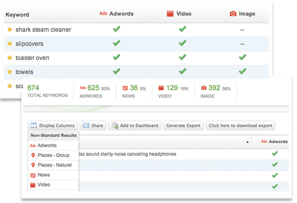 Searchlight通過自然搜索、競(jìng)價(jià)排名,視頻、圖片及新聞等各個(gè)角度的統(tǒng)計(jì)結(jié)果,進(jìn)行分析。搜索結(jié)果提供了大量的新機(jī)會(huì),以此來驅(qū)動(dòng)流量和擴(kuò)大客戶量。Searchlight提供你這樣的洞察力,通過關(guān)鍵詞上的結(jié)果,讓你在不同的結(jié)果類型中有的機(jī)會(huì)或競(jìng)爭(zhēng)力。