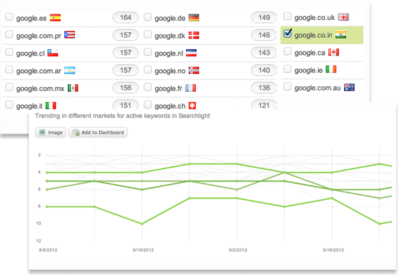 對(duì)于企業(yè)品牌、產(chǎn)品及服務(wù)來說,國際市場(chǎng)提供了這樣一個(gè)新的機(jī)會(huì),通過Searchlight,你可以達(dá)到實(shí)時(shí)的國際擴(kuò)展。Searchlight支持超過30個(gè)國際市場(chǎng)和不同語種,所以你可以方便地監(jiān)測(cè)全球的視角。跨越國際化搜索引擎,來跟蹤你的搜索引擎性能和排名,以前是從未有過的。通過不同地區(qū)的搜索引擎,創(chuàng)建分類并比較性能,這樣來觀察同樣的關(guān)鍵詞是如何在不同區(qū)域的搜索引擎上展示的。