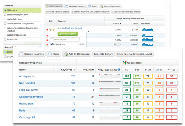 在Searchlight中,關鍵詞類目是非常靈活的,一切由你來決定如何去跟蹤。類目可以用來監(jiān)控和衡量你組織的,戰(zhàn)術的,或者戰(zhàn)略的目標,而這些是以前所沒有的。在你的關鍵詞種類中,為你及競爭對手獲得詳細的洞察力,以便觀察你如何對比市場份額,關鍵詞性能,以及分析度量,并能讓你發(fā)現更多競爭者。